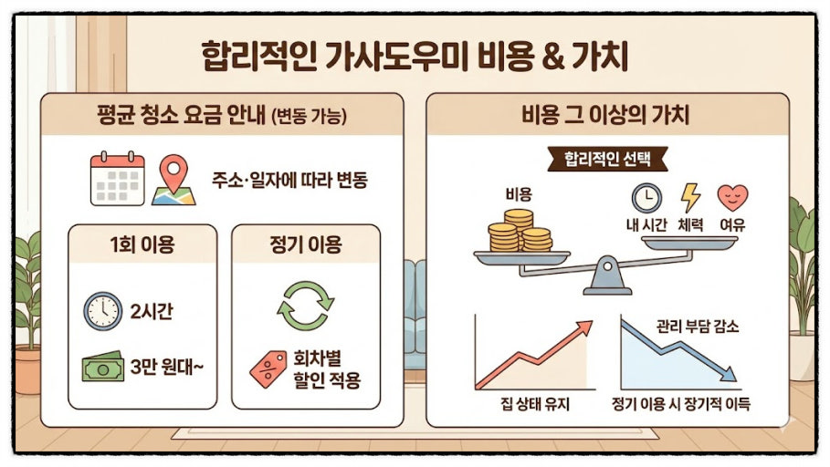 가사도우미 비용은 지역, 경력, 업무 범위에 따라 차이가 큽니다. 아래는 2026년 기준 평균 범위입니다.