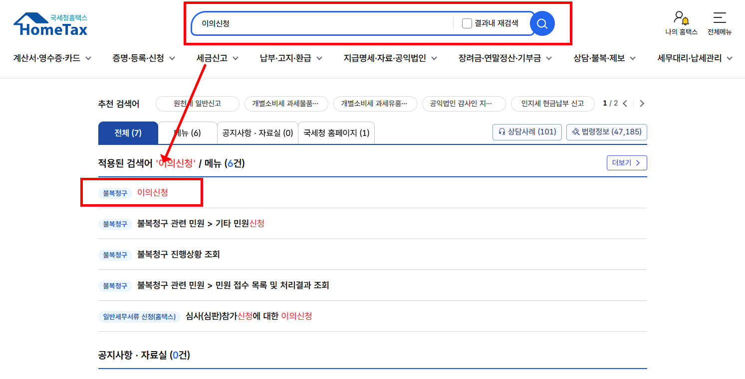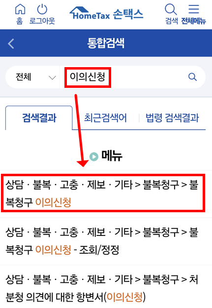 2. 로그인 → 홈페이지 검색창에 이의신청 검색