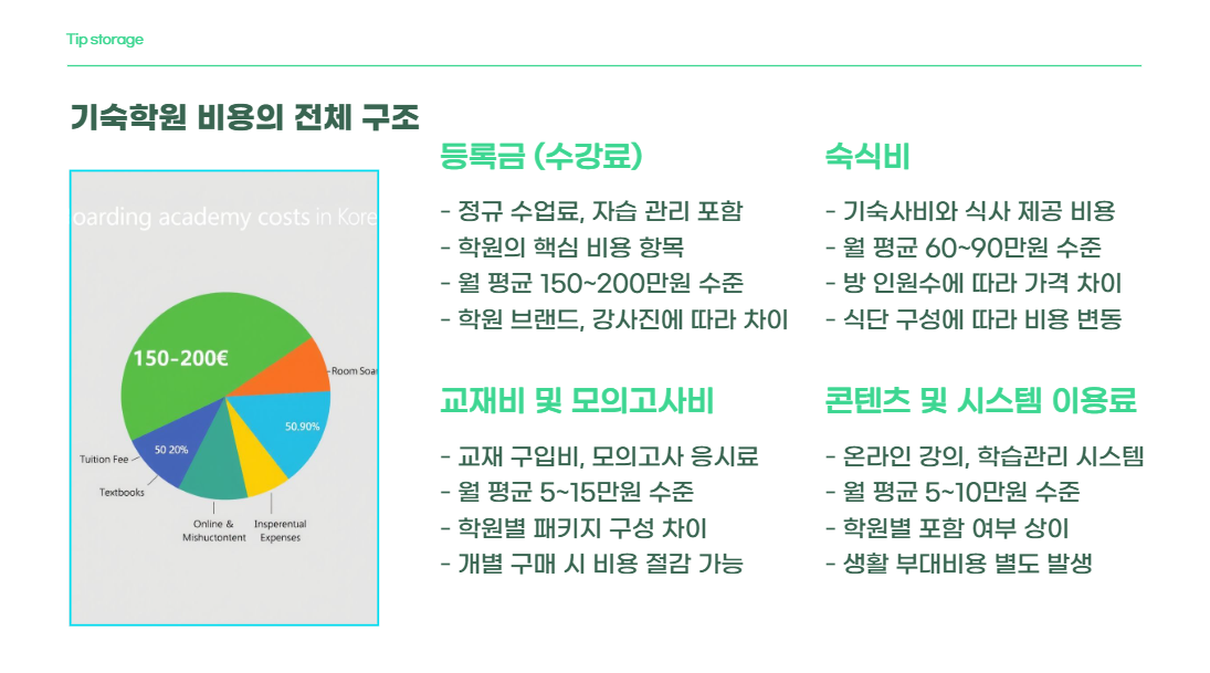 - 독학형 기숙학원은 자습 중심 운영으로, 월 180만~250만 원 수준인 경우가 많습니다.