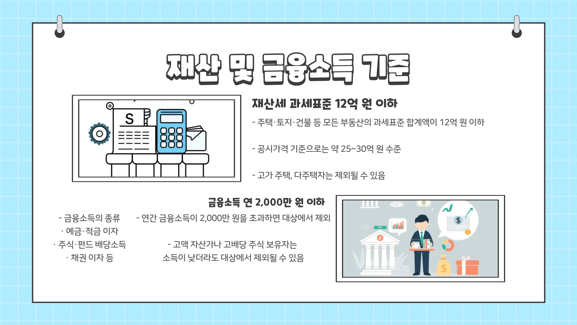 따라서 고액 자산가나 고배당 주식 보유자는 소득이 낮더라도 대상에서 빠질 수 있습니다.