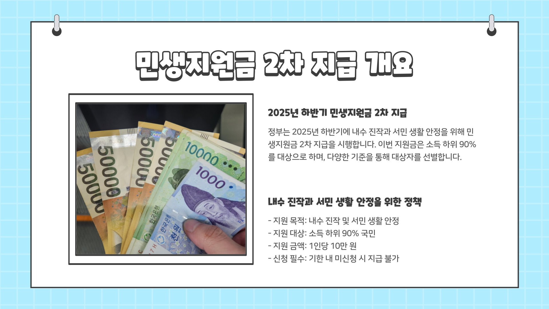 2025년 하반기, 정부는 내수 진작과 서민 생활 안정을 위해 민생지원금 2차 지급을 시행한다고 발표했습니다.
