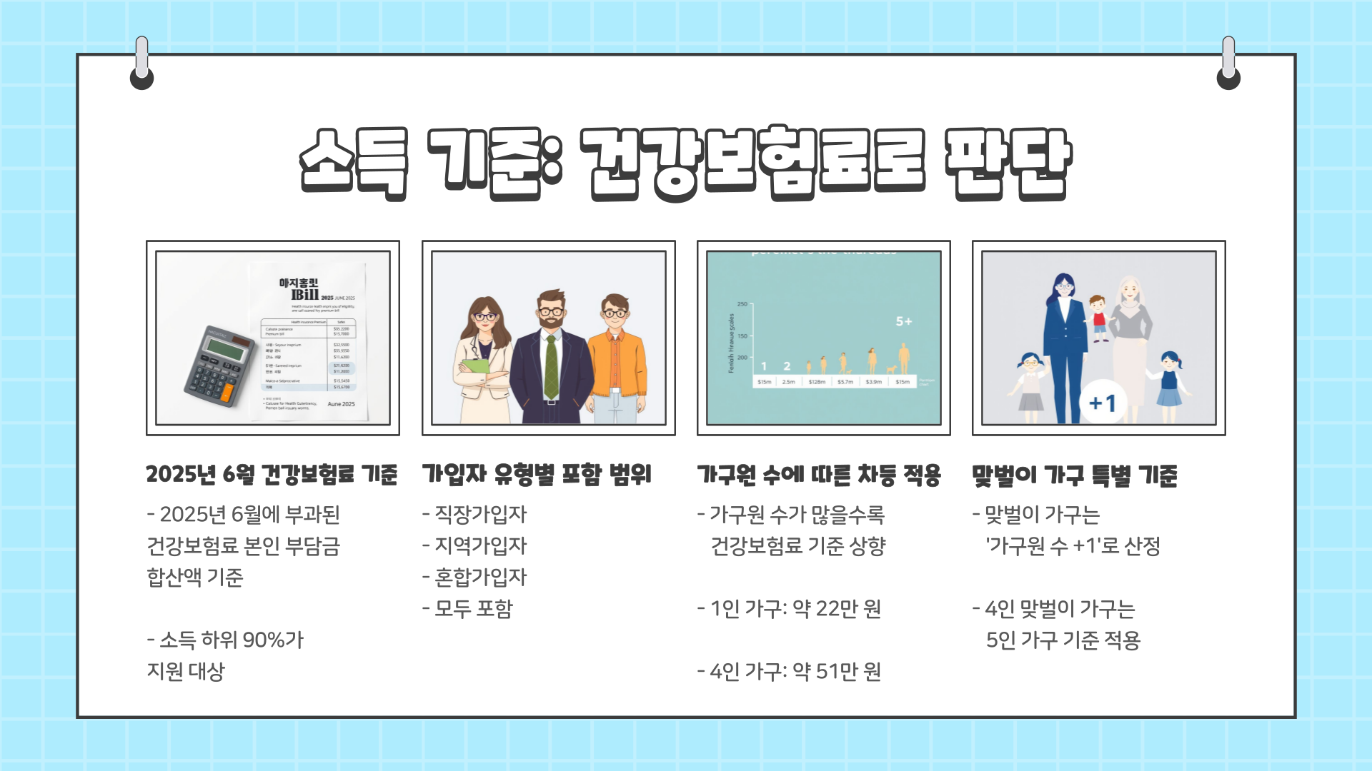 - 맞벌이 가구는 “가구원 수 +1”로 산정해 기준이 완화되었습니다.
