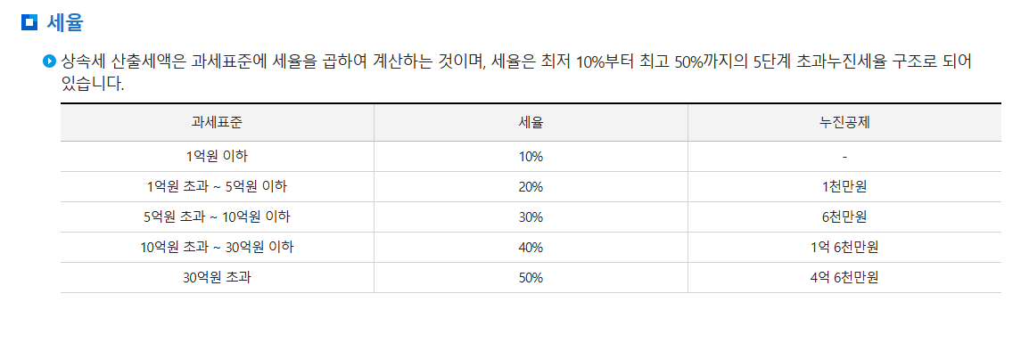상속세는 누진세율 구조로, 상속재산의 규모에 따라 다음과 같이 과세됩니다.