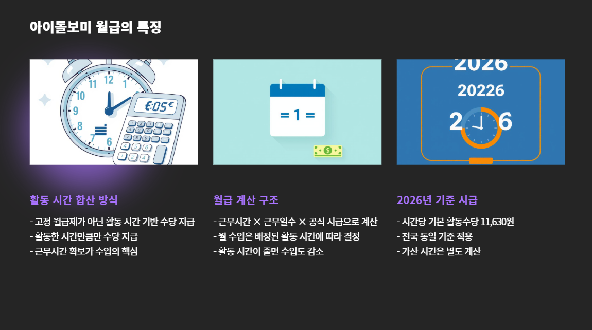 아이돌보미 월급은 고정 월급제가 아니라 활동 시간 합산 방식으로 계산됩니다. 즉, 근무시간 × 근무일수 × 공식 시급이 한 달 수입을 결정합니다.