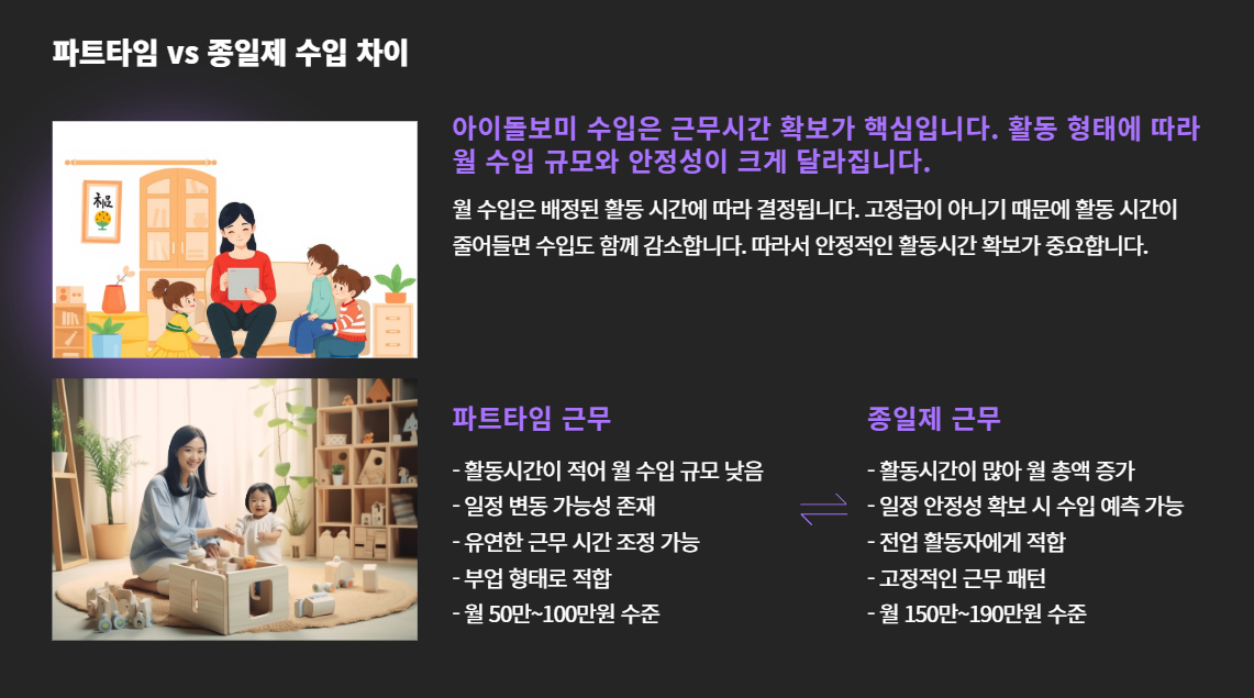 아이돌보미는 활동 시간 합산 방식이므로 활동이 줄면 월 수입도 감소합니다.