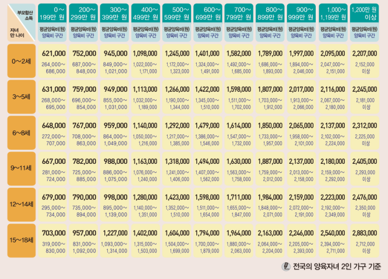 이전 기준에 비해 현실적 수준으로 조정되었으며, 자녀 연령에 따른 차이와 부모 소득 구간을 보다 세분화한 것이 특징입니다.