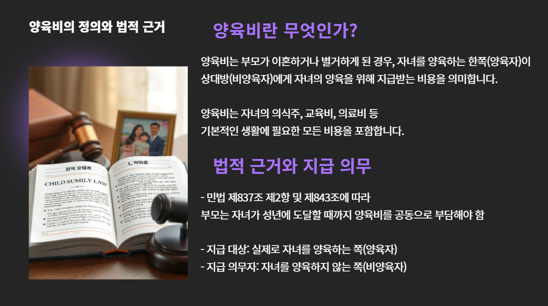 자녀를 양육하는 한쪽(양육자)이 상대방(비양육자)에게 자녀의 양육을 위해 지급받는 비용을 의미합니다.