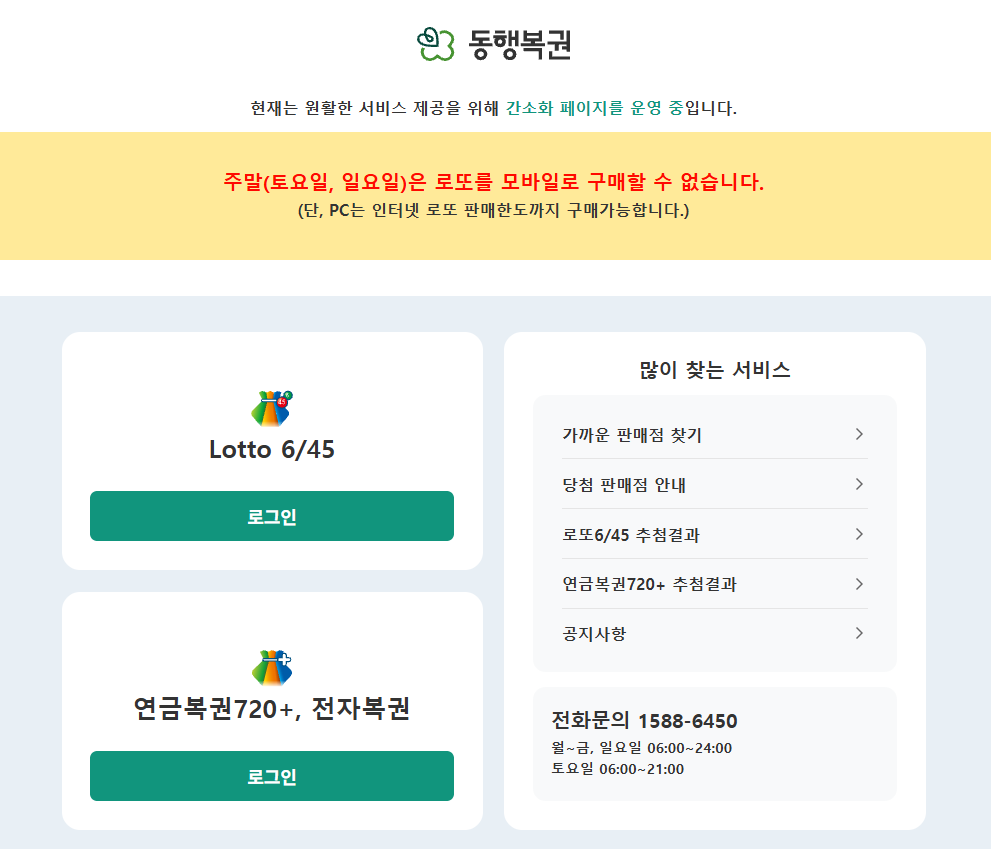 현재는 원활한 서비스 제공을 위해 간소화 페이지를 운영 중입니다. 로그인 에는 모바일 구매가 제한됩니다. ※ PC에서는 인터넷 로또 판매한도까지 구매가능합니다. 연금복권720+, 전자복권 로