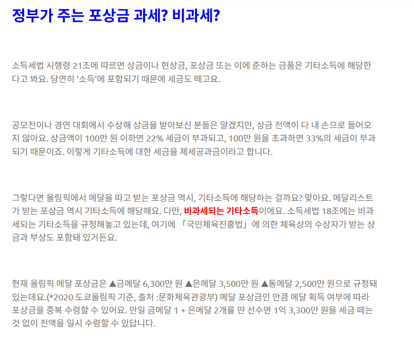 정부가 지급하는 올림픽 메달 포상금은 관련 세법에 따라 비과세 소득에 해당합니다.