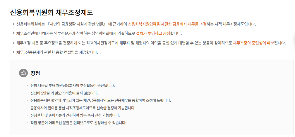 채무조정은 신용회복위원회를 통해 운영되는 제도로, 연체자나 연체가 우려되는 분들을 대상으로 한 금융 지원 제도입니다.