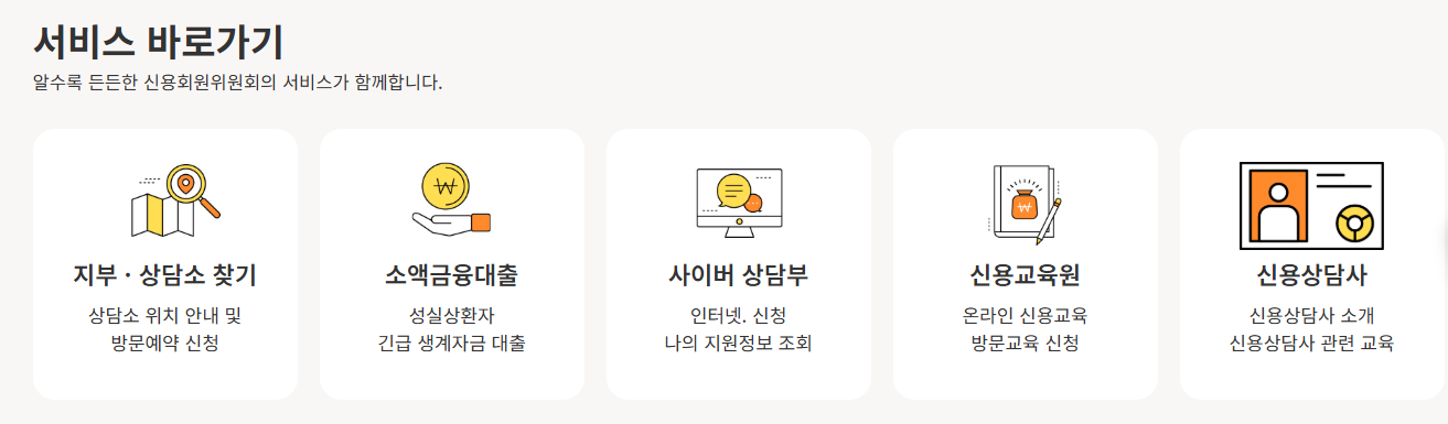 채무종합상담, 신속채무조정, 사전채무조정, 개인워크아웃, 개인회생·파산, 신용교육, 신용복지컨설팅, 복지연계서비스