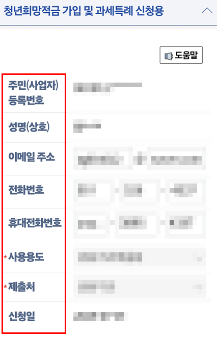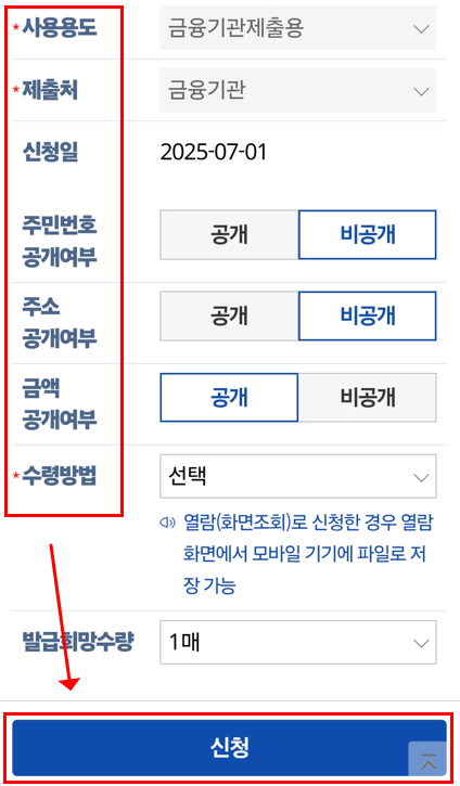 예를 들어 해당 내용의 경우 아래 기본 인적 사항, 신청내용, 수령방법이 뜨는데