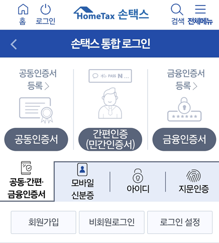 - 공동인증서, 간편인증(네이버, 카카오 등), 금융인증서 중 선택하여 로그인