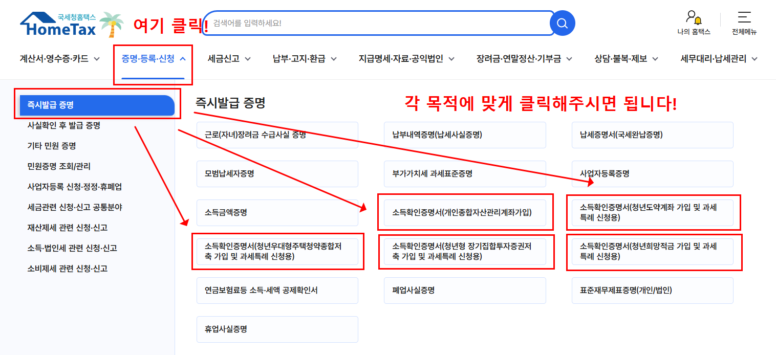 - [증명 등록 신청] → [즉시발급 증명] → [소득확인증명서 발급] 메뉴 선택