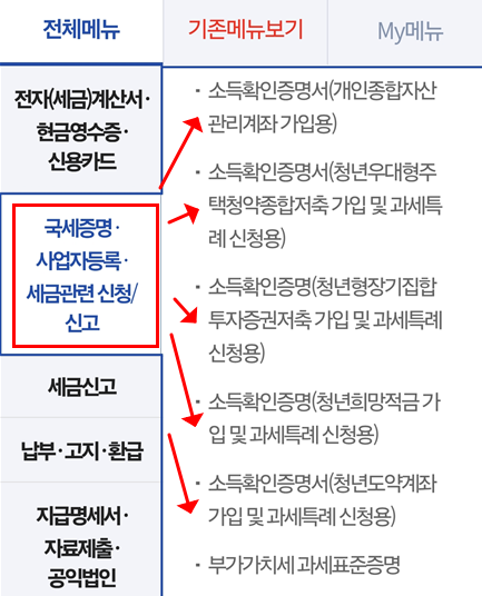 (*최신 화면 기준으로 위치가 다를 수 있으니, 메뉴 내 검색창에 '소득확인증명서'를 입력해도 쉽게 찾을 수 있습니다.)