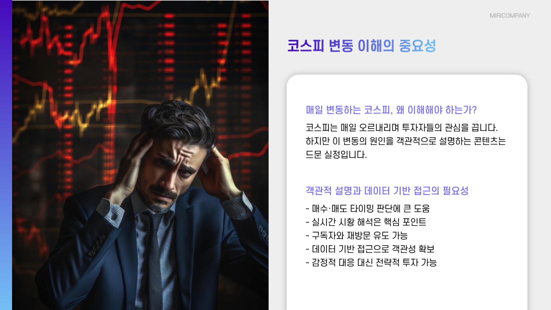 코스피는 매일 오르내리지만, 그 ‘이유’를 객관적으로 설명하는 콘텐츠는 드물어요.