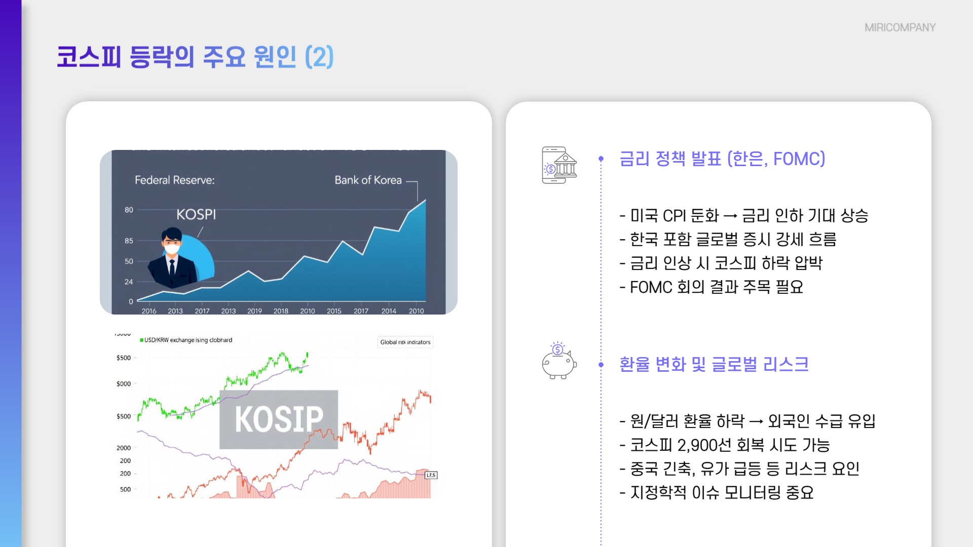 - 미국 CPI 둔화 → 금리 인하 기대 → 한국 포함 글로벌 증시 강세 흐름 반영됨.