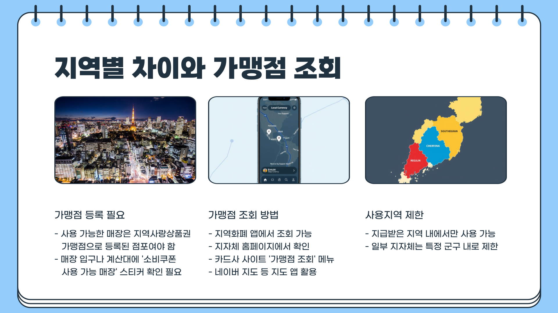 - 가맹점 조회는 지역화폐 앱, 지자체 홈페이지 또는 카드사 사이트에서 가능합니다.