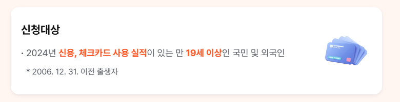 | 카드 사용 실적 요건 | 2024년 본인 명의의 신용카드 또는 체크카드 사용 내역 있음 |