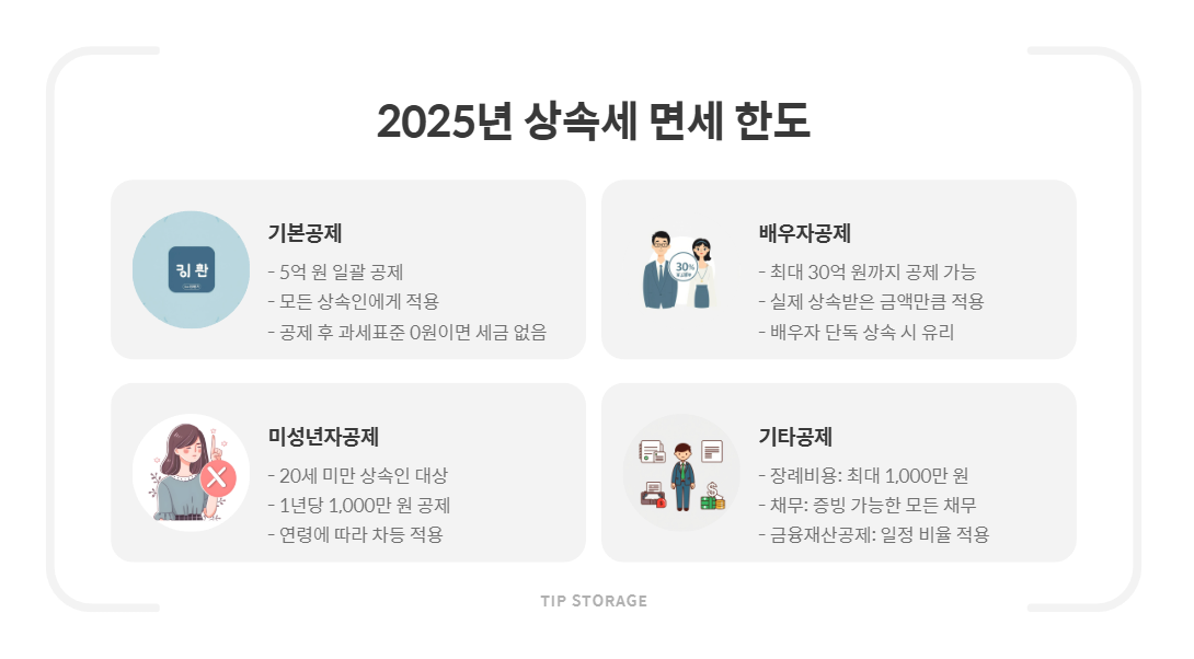- 기본공제 5억 원, 배우자공제 최대 30억