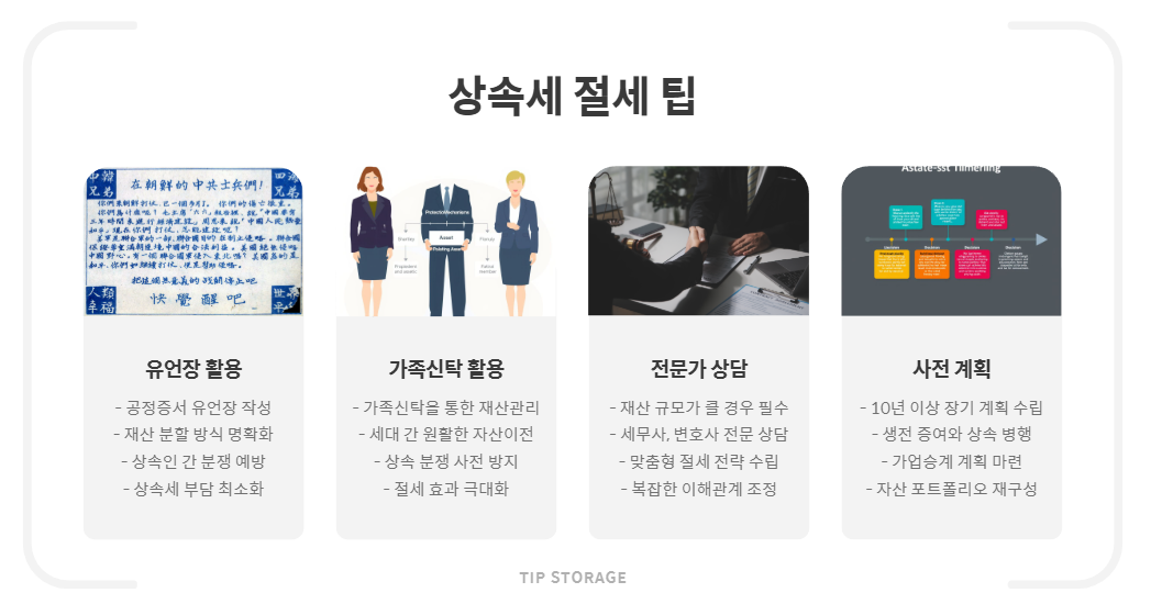 재산 규모가 크거나 이해관계가 복잡한 경우, 상속세 전문 세무사 또는 변호사의 상담을 사전에 받아 절세 전략을 세우는 것이 유리합니다.