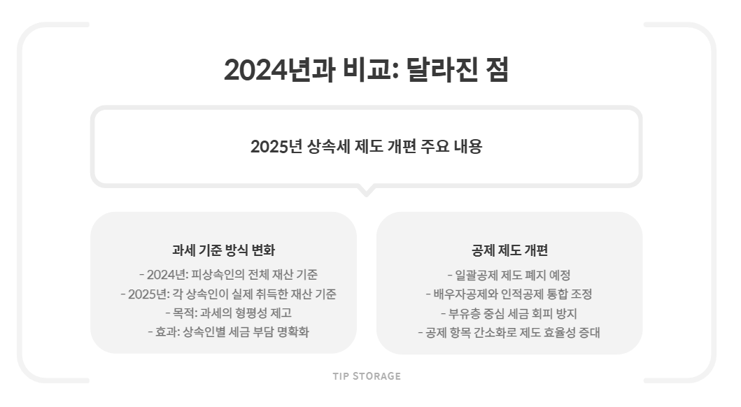 2024년까지는 ‘피상속인의 전체 재산’을 기준으로 상속세를 계산했습니다. 그러나 2025년부터는 ‘각 상속인이 실제 취득한 재산’을 기준으로 과세하는 방향으로 제도 개편이 추진되고 있습니다.