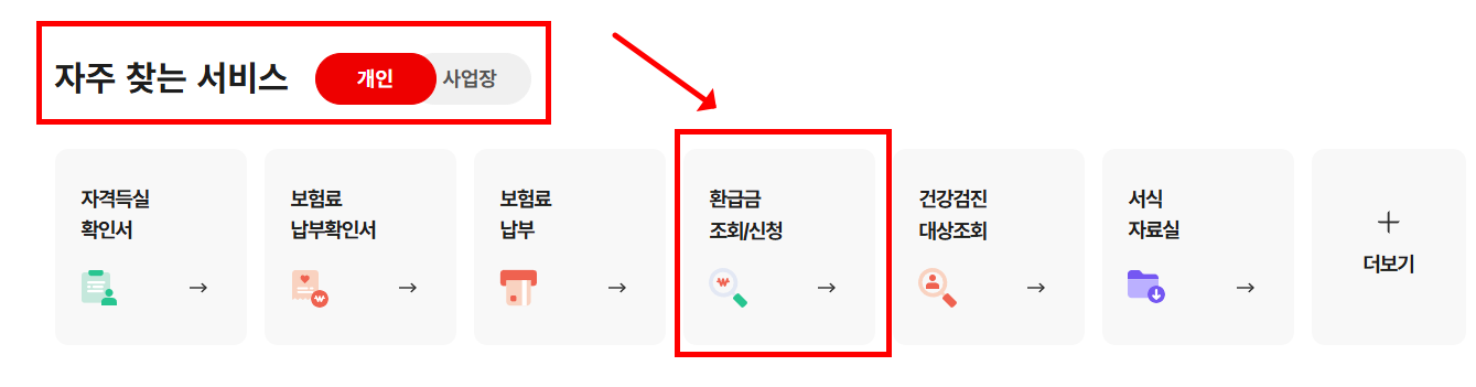 - [자주 찾는 서비스] 메뉴 → [환급금 조회/신청] 클릭