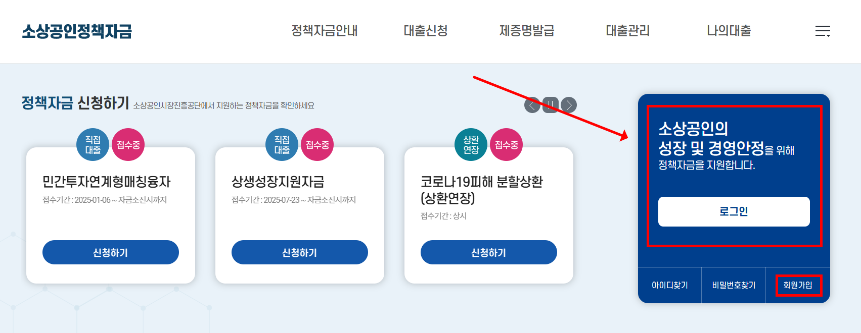 소상공인정책자금(OLS) 누리집 접속 → 회원가입 및 로그인 → 자금 종류 선택 후 신청