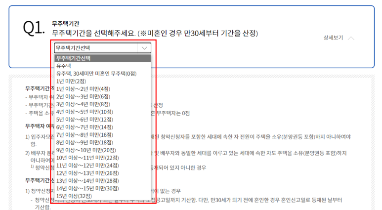 2. Q1에서 보시면 무주택기간을 선택해서 가점 확인이 가능한데 오른쪽에 상세보기 창을 열어보시면 무주택부터 그 이상까지의 여러가지 정보들에 대해 알 수 있습니다.