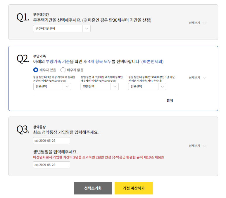 4. 여기서 입주자모집 공고일, 생년월일, 혼인여부, 혼인신고일, 주택 소유 여부, 무주택자가 된 날 등등을 넣고 계산하기를 눌러주시면 점수가 나오게 됩니다.