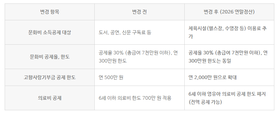 - 연말에 각종 **공제 항목(신용카드, 교육비, 의료비 등)**을 반영