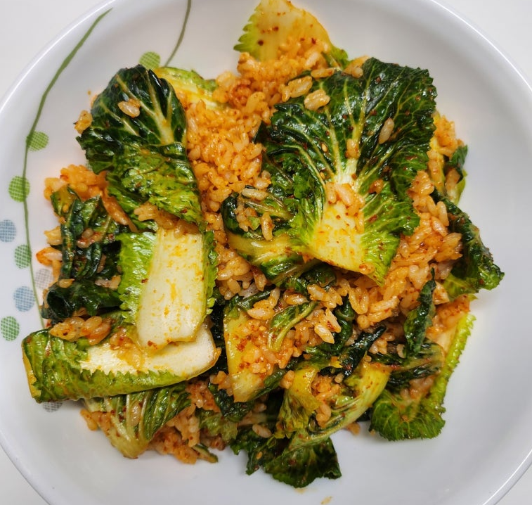 - 봄동을 손질하고 세척한 뒤 물기를 충분히 털어냅니다. 물기가 많으면 양념이 묽어지고 밥이 질어집니다.