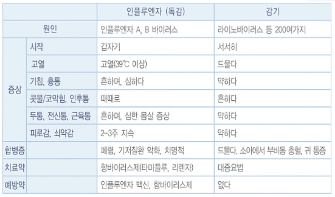 | 주요 증상 | 고열, 오한, 기침 | 고열, 근육통, 인후통 |