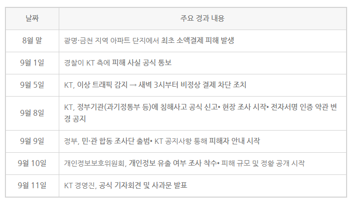 - KT는 고객 대상 개인정보 유출 통지를 시작했고, 피해 여부 확인을 위한 전담 고객센터를 운영 중입니다.